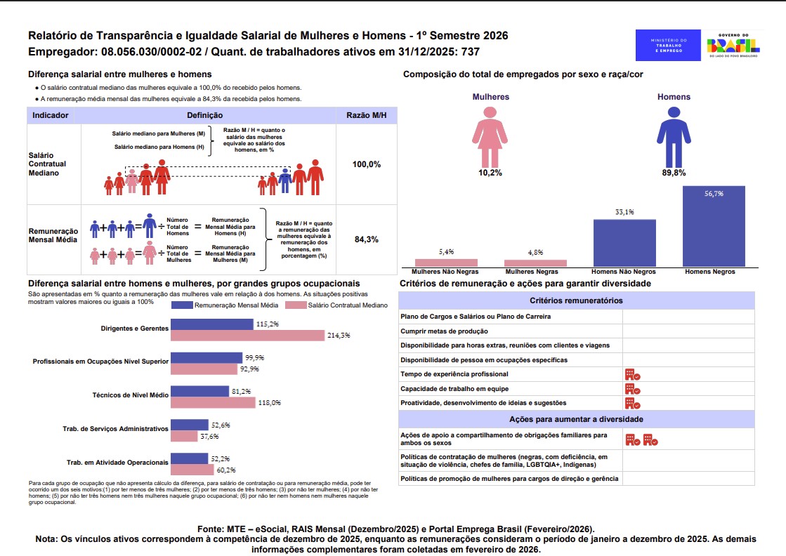 Apresentamos aqui o relatório gerado pelo Ministério do Trabalho e Emprego, juntamente com o Ministério das Mulheres, em relação aos salários de nossa equipe no ano de 2026.
